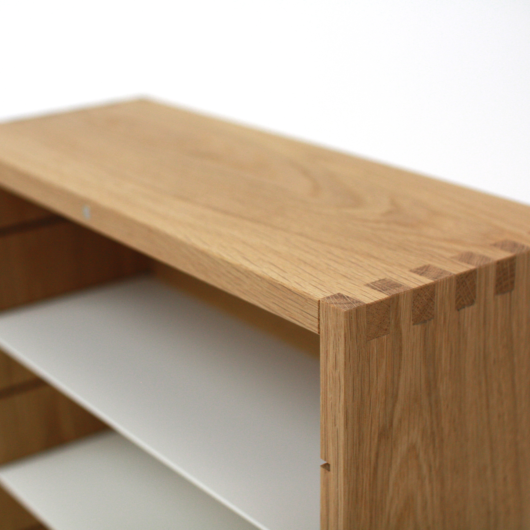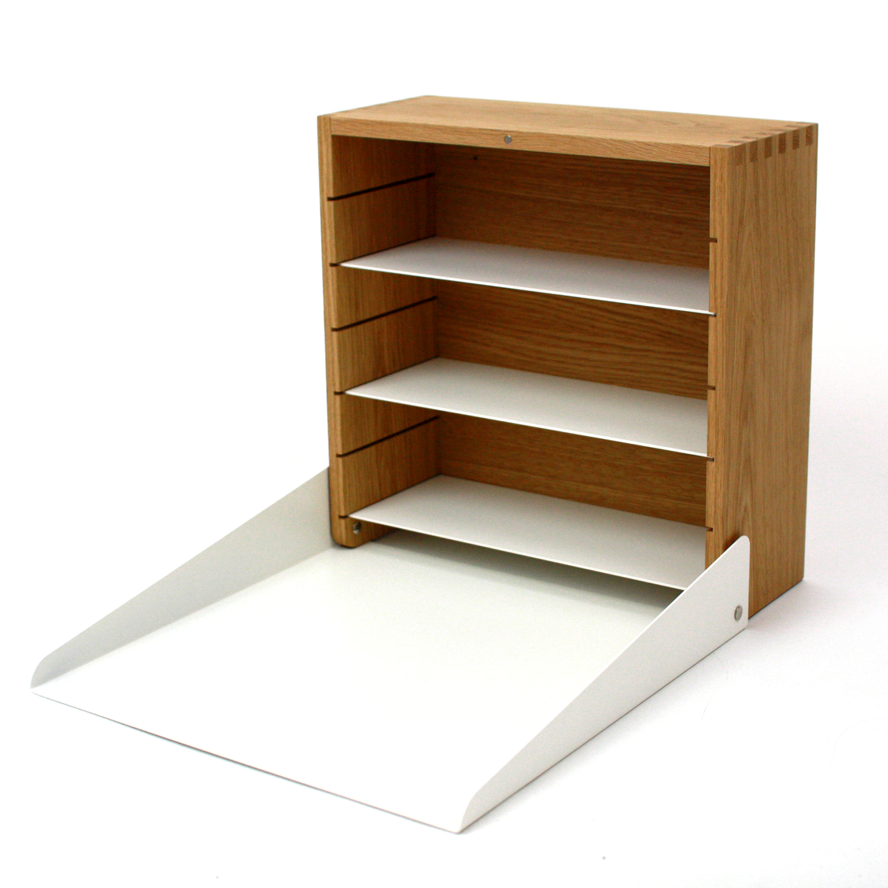 Material: Klappe und Böden aus pulverbeschichtetem Stahlblech, Korpus aus massiver lackierter Eiche