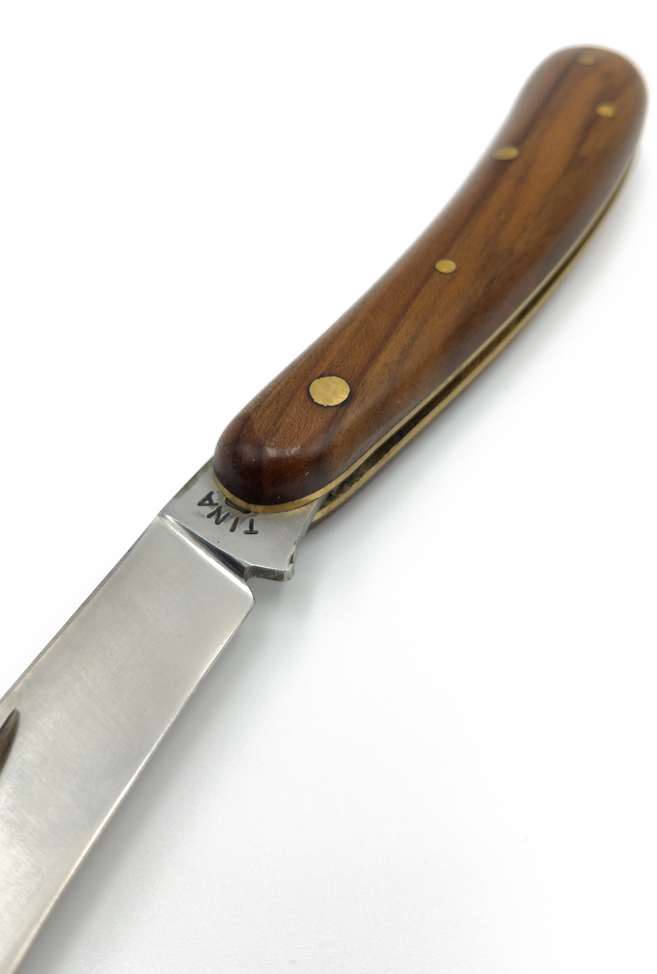 Die beiden Schalen sind mit einem Kern vernietet, der aus massivem Hartmessing besteht und glanzpoliert wurde. Innen versteckt sich eine starke Feder, die dafür sorgt, dass die Klinge nicht einknickt, wenn leichter Druck beim Arbeiten ausgeübt wird.