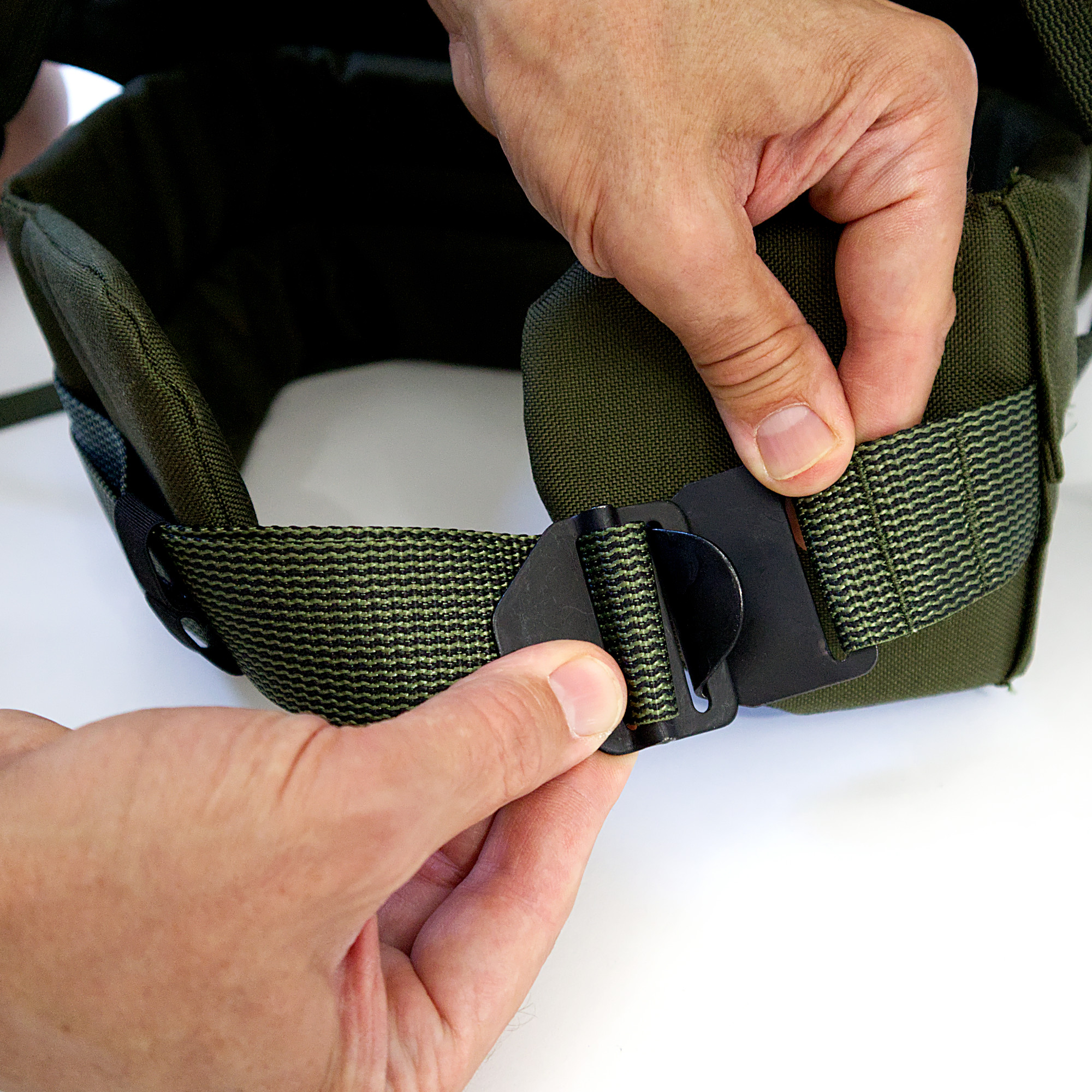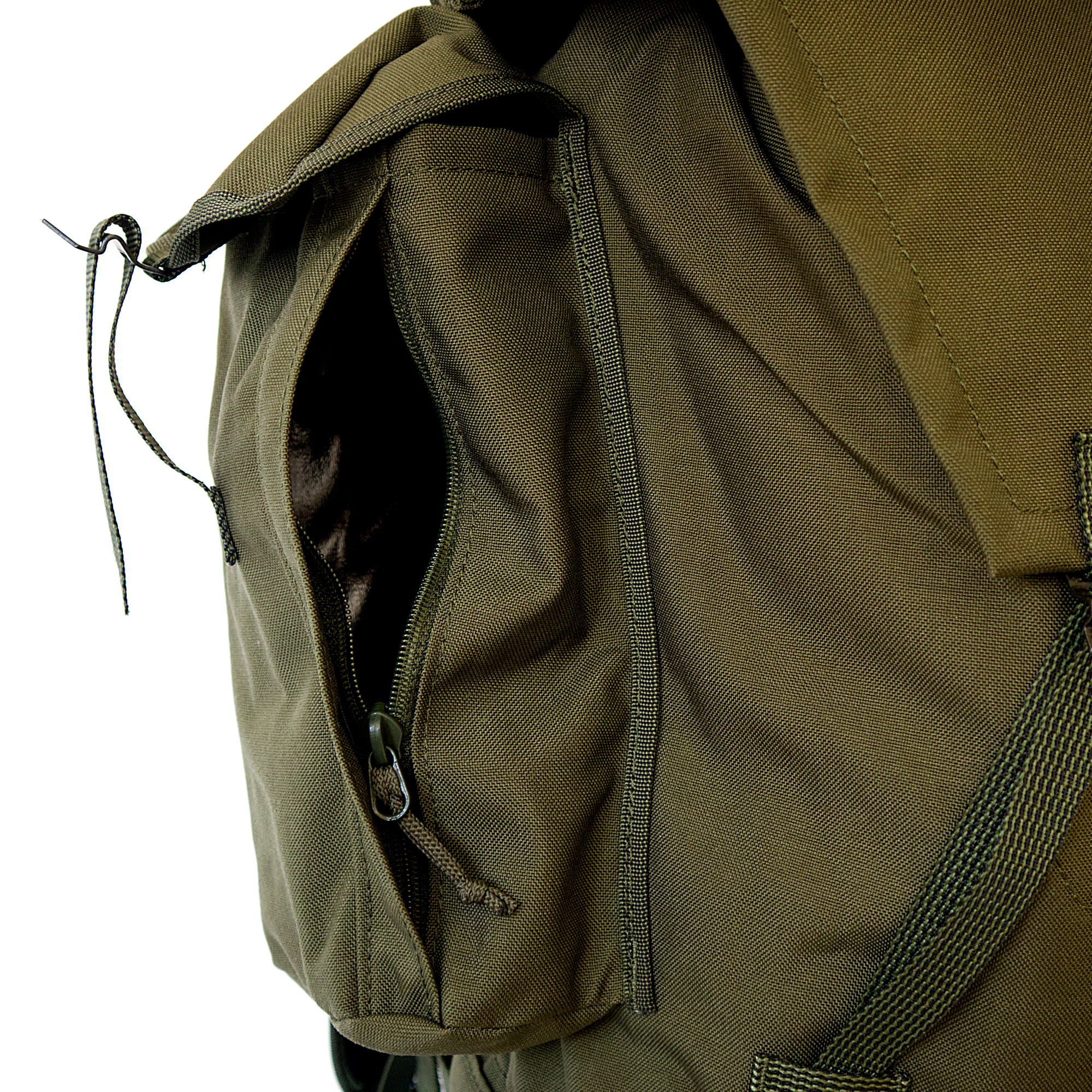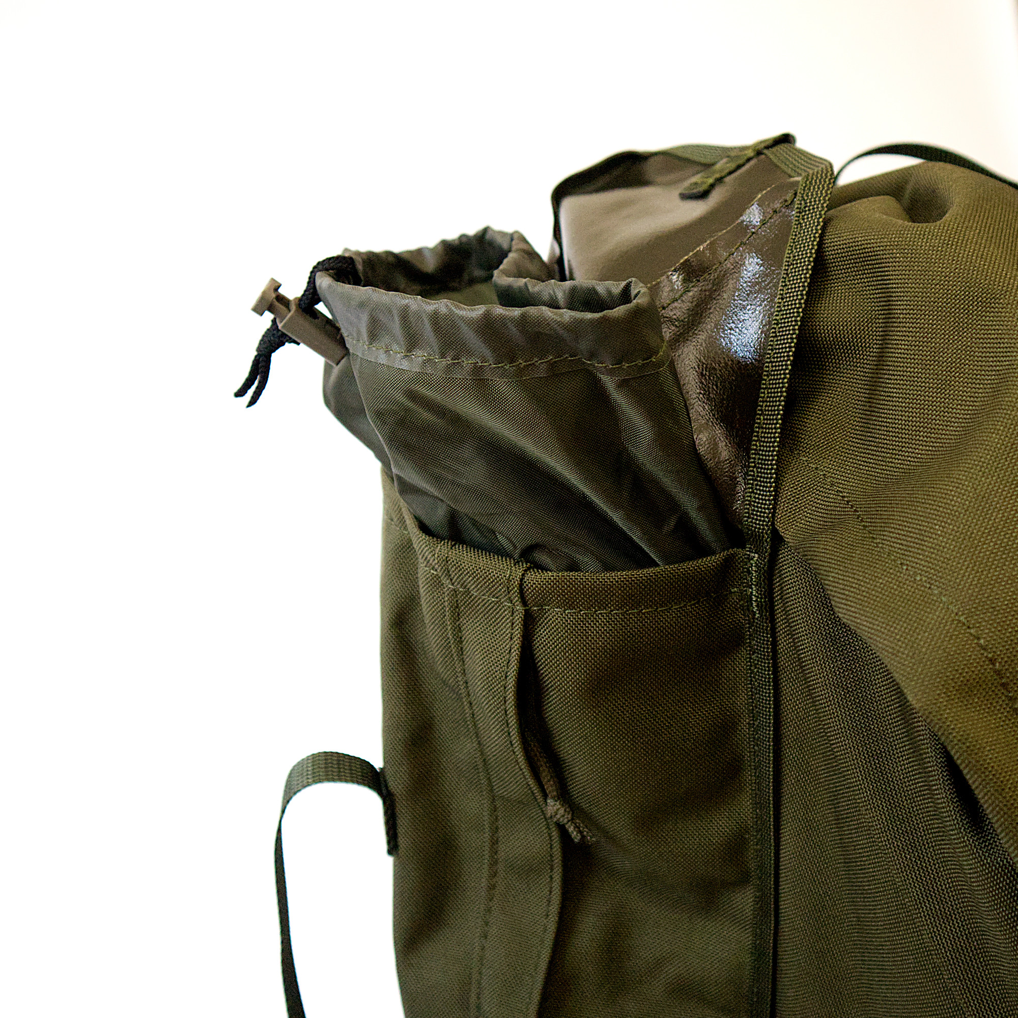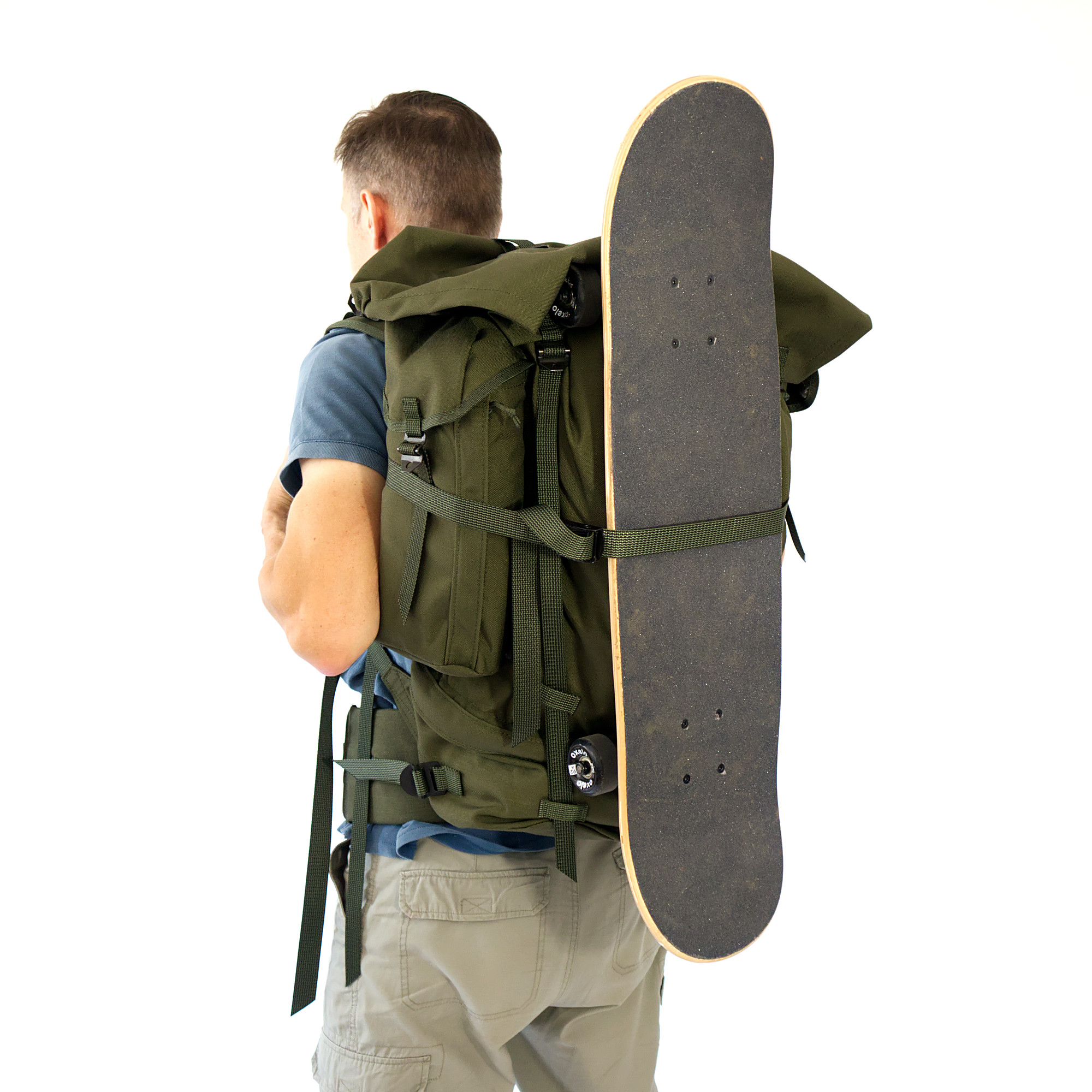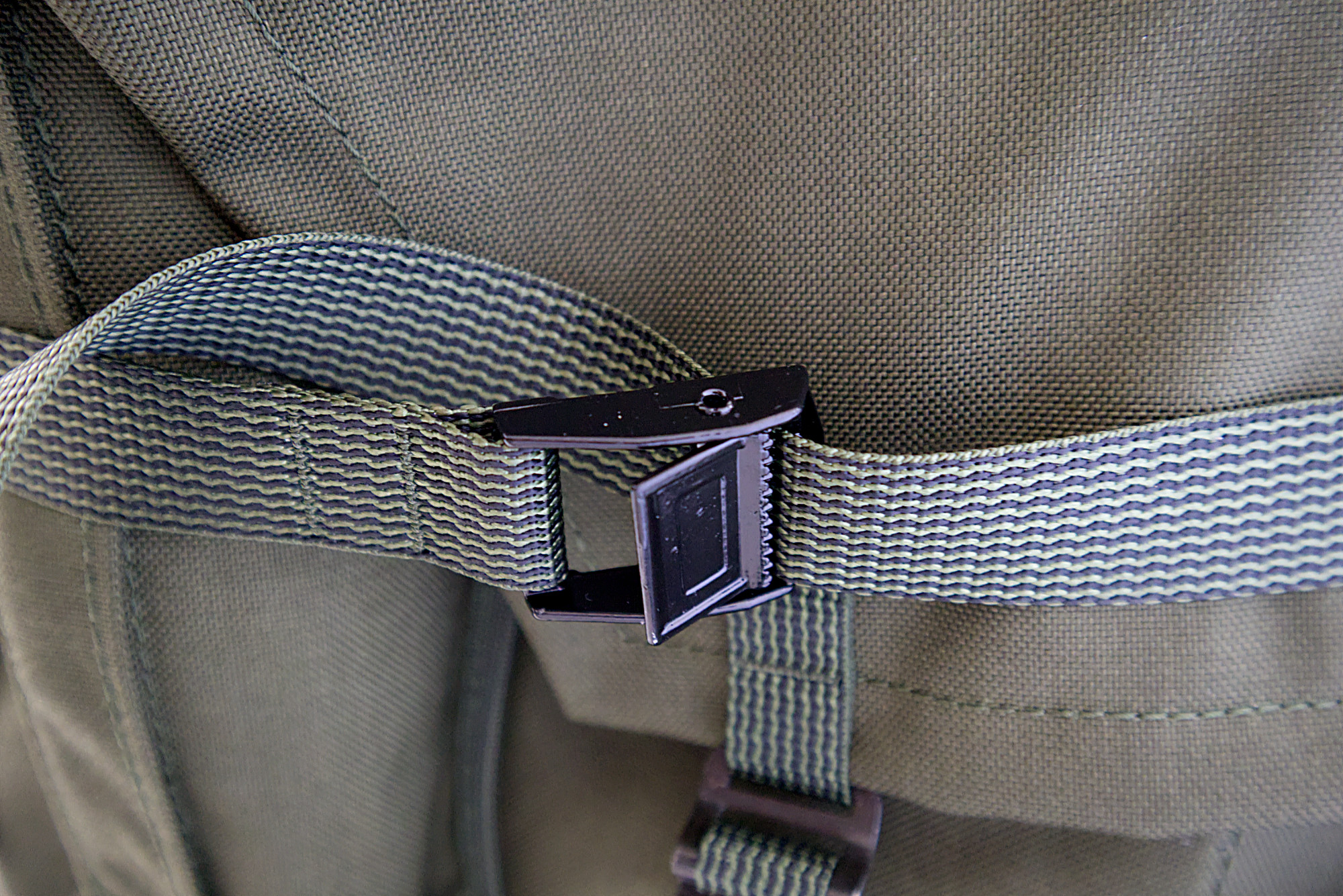 An der Unterseite können beispielsweise ISO-Matten oder Zelte angebracht werden. Vier kleine sowie ein großer zentraler Kompressionsriemen sorgen für eine kompakte Endgröße. An der „Gewehrschlaufe“ können beispielsweise auch Klappstühle, Stative oder Ähnliches angebracht werden.